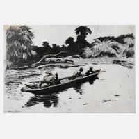 Einbaum auf einem Fluss mit weißem Jäger, seinen eingeborenen Begleitern ein Zeichen gebend, Tusche und Deckweiß auf Papier, links unten signiert und datiert „Moritz Pathé (19)30“, auf Rahmenrückseite betitelt „Auf der Krokodiljagd“ und Etikett „Gustav Knauer, Berlin Kunst-Abteilung 2103“, minimale Erhaltungsmängel, hinter Glas freistehend gerahmt, Blattmaße ca. 33 x 47 cm. Künstlerinfo: dt. Tier- und Jagdmaler, Restaurator, Illustrator sowie Afrikaforscher und Schriftsteller (1893 Berlin bis 1956 Essen), Sohn des Berliner Illustrators und Bildnismalers Moritz Pathe (1858-1907), Schüler der Berliner Kunstgewerbeschule, anschließend als Pressezeichner für den Ullstein-Verlag tätig, arbeitete zeitweise als Restaurator (Kaiserschloss Posen, Berliner Dom, Münster Aachen, Kaiser Wilhelm Gedächtniskirche Berlin) und Schöpfer von Innenraumdekorationen (RMS Titanic), unternahm zahlreiche Expeditionen nach Westafrika, welche er schriftstellerisch in selbst illustrierten Reiseberichten verarbeitete, parallel als Illustrator für den Schneider-Verlag tätig und zeitweise Dozent für Malerei an den "Studien-Ateliers für Malerei und Plastik" in Berlin-Charlottenburg, Malaufenthalte in der Malerkolonie Schwalenberg, tätig in Berlin, in den 1930er Jahren Übersiedlung nach Essen, im 2. Weltkrieg zeitweise in Himmighausen, Quelle: Vollmer, Saur "Bio-Bibliographisches Künstlerlexikon", Info Frank Jahnke und Wikipedia.