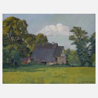 Blick über sonnige sommerliche Wiese zum Anwesen, unter üppig grünen Laubbäumen, Gouache, rechts unten signiert und datiert "K. Rumpel 1922", rückseitig Farbproben, Annotation "No. 115 Altgold 50 x 42 cm" und Montierungsreste, geringe Altersspuren, ungerahmt, Blattmaße ca. 30 x 40 cm. Künstlerinfo: eigentlich Karl Ernst Friedrich Rumpel, dt. Bildnis-, Tier-, Landschafts- und Genremaler, Illustrator und Graphiker (1867 Potsdam bis 1939 Demmin), studierte an der Unterrichtsanstalt am Kunstgewerbemuseum Berlin bei Max Koch, weitergebildet bei Friedrich Wilhelm Theodor Heyser in Dresden und Schüler der Kunstschule Weimar bei Max Thedy, Mitglied im Reichsverband Bildender Künstler Deutschlands, im Pommerschen Künstlerbund und im Ausstellungsverein Pommerscher Künstler Stettin, erwähnt in Quedlinburg, Aschersleben, Leipzig, Halle und Erfurt, zeitweise in Goslar ansässig, später in Berlin-Friedenau und schließlich in Demmin/Pommern, Quelle: Thieme-Becker, Müller-Singer, Saur, AKL und Dressler.