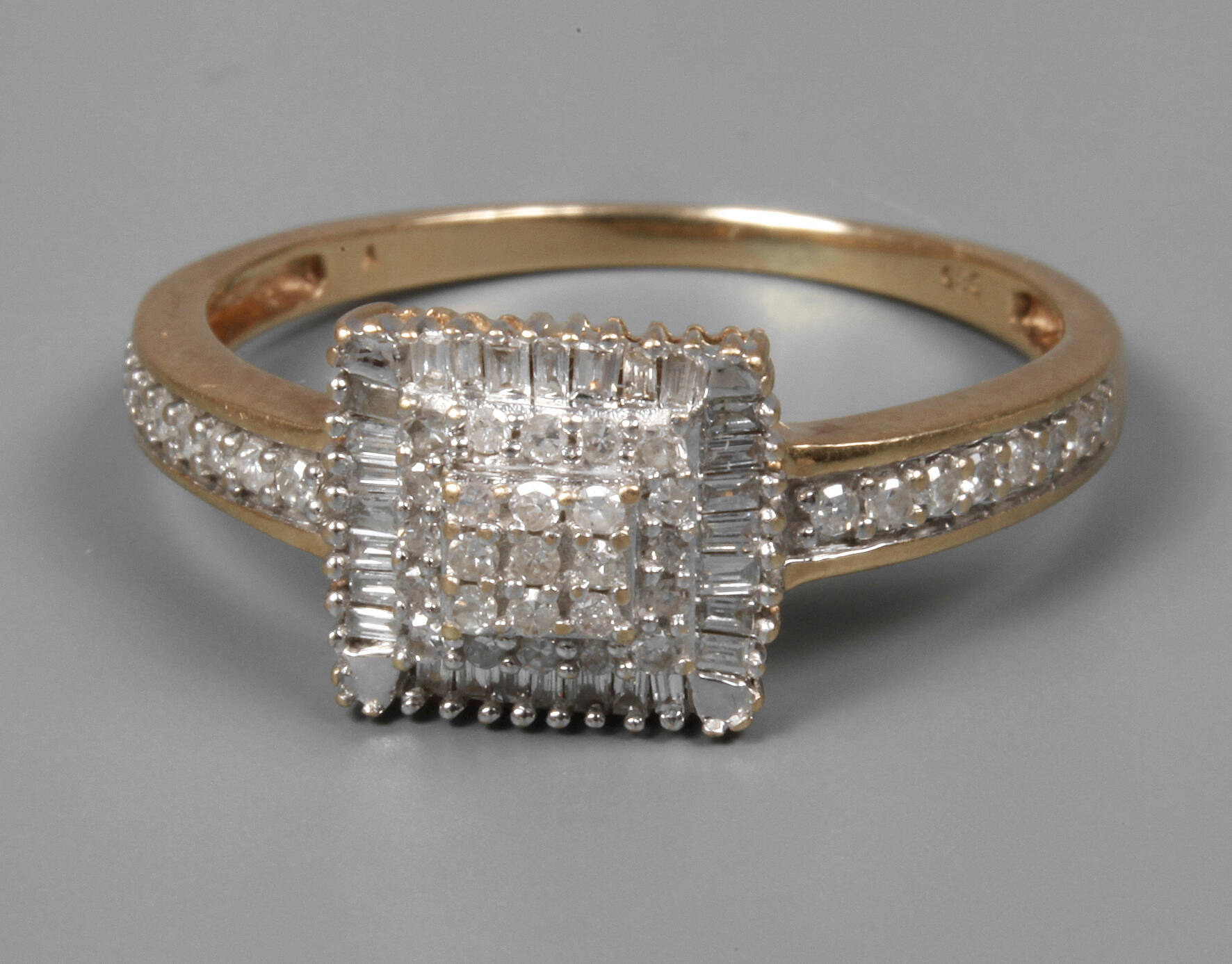 neuzeitlich, Weiß- und Gelbgold gestempelt 585, besetzt mit ca. 24 Diamantbaguettes und 42 Achtkantdiamanten, im Gesamtgewicht von ca. 0,5 ct, minimale Tragespuren, RW 20 mm, G ca. 3,5 g.