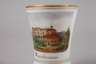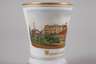Mitte 19. Jh., aus weißem Milchglas, plangeschliffener Stand, konischer Fußbecher, schauseitig polychrom mit opaken Emaillefarben bemalt, Goldstreifendekor, am Lippenrand eine winzige ausgebesserte Stelle, sonst guter Zustand, H 11,5 cm.