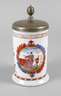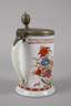2. Hälfte 18. Jh., nach innen gewölbter Boden mit blasigem Abriss, Zylinderform mit angesetztem Henkel, feine Bemalung mit bunten Opakemaillefarben, mittig Chinoiserie in runder Kartusche, seitlich Blumenranken, umlaufend Ornamentbänder, übergreifender Deckel mit Kugelrast, kaum sichtbar ein langer Haarriss durch das Bild, H 21 cm.