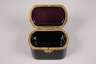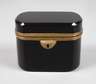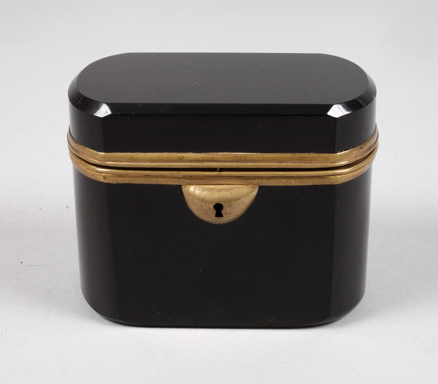 1. Hälfte 19. Jh., aus schwarz scheinendem, dunkelviolettem Glas, abgerundete Rechteckform, vergoldete Messingmontierung, Schlüssel fehlt, sonst normale Alters- und Gebrauchsspuren, L 13 cm.