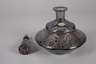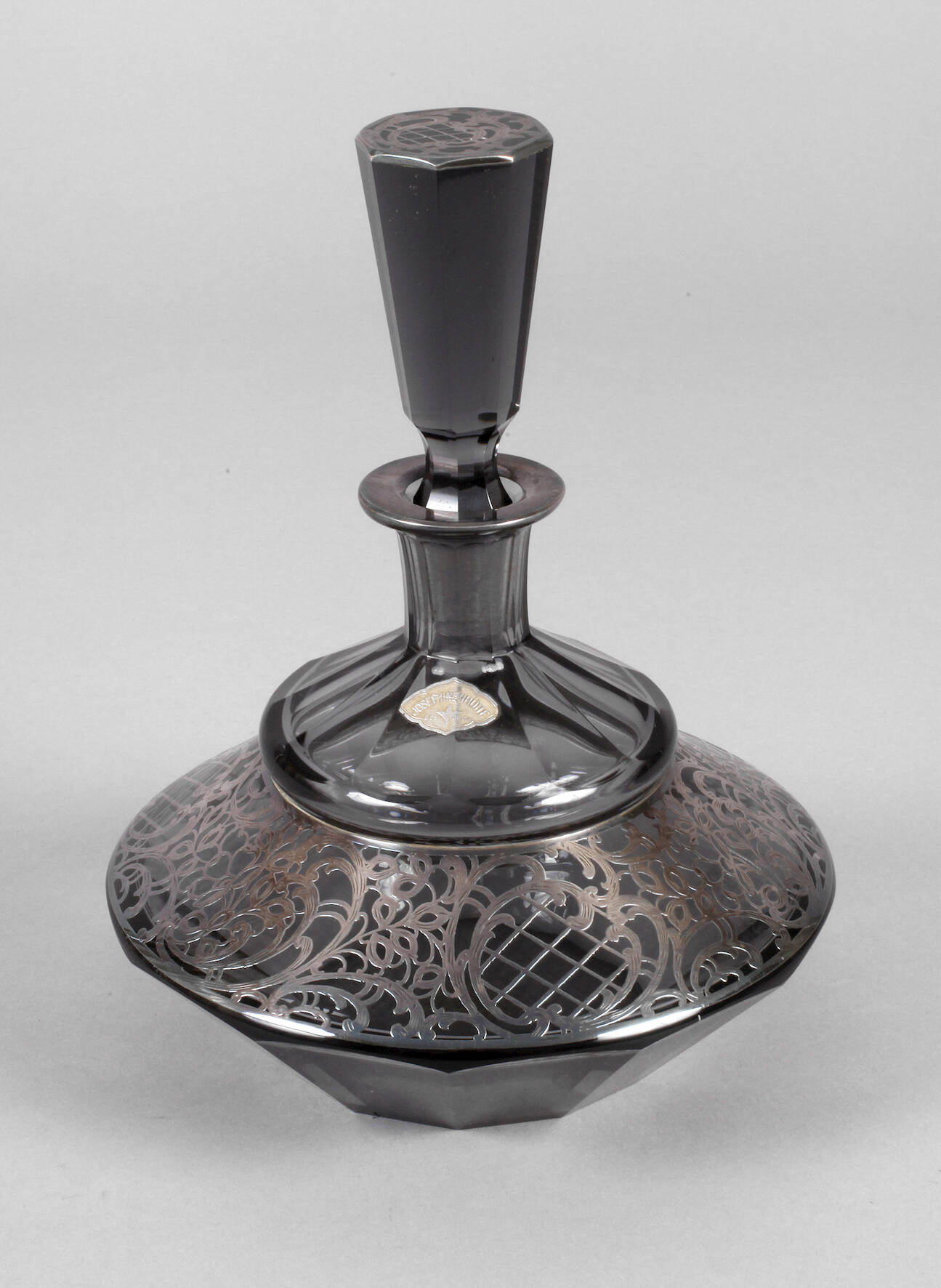 1930er Jahre, rauchgraues Glas, plangeschliffener Stand, facettiert mit galvanischer Silberauflage, Gitterdekor und Blattranken, originales Klebeetikett, hoher Stopfen, guter Zustand, H 23 cm.