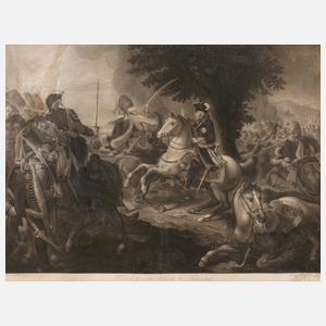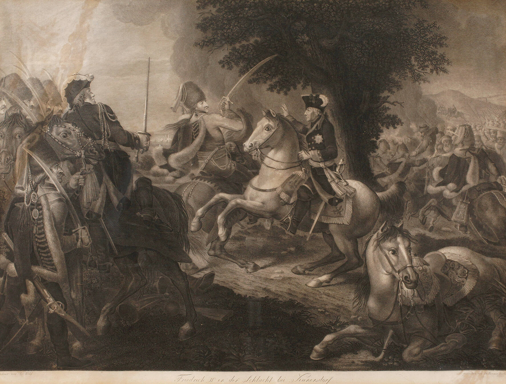 der Preußenkönig zu Pferde im Schlachtengetümmel, Radierung, Ende 18. Jh., unter der Darstellung bezeichnet "gezeichnet von L. Wolff" und "gestochen von D. Berger Berlin" sowie betitelt "Friedrich II in der Schlacht bei Kunersdorf", Erhaltungsmängel, unter Passepartout und hinter Glas gerahmt, Passepartoutausschnitt ca. 43 x 57 cm. Künstlerinfo: eigentlich Gottfried Daniel Berger, dt. Kupferstecher, Zeichner und Illustrator (1744 Berlin bis 1824 Berlin), Schüler seines Vaters Friedrich Gottlieb Berger, studierte ab 1757 an der Berliner Akademie bei Blaise Nicolas Le Sueur, ab 1774 Schüler des Hofkupferstechers Georg Friedrich Schmidt, ab 1778 Mitglied der Berliner Akademie, ab 1787 Professor an der Berliner Akademie und 1816–24 deren Vizedirektor, tätig in Berlin, Quelle: AKL, Thieme-Becker und Internet.