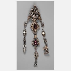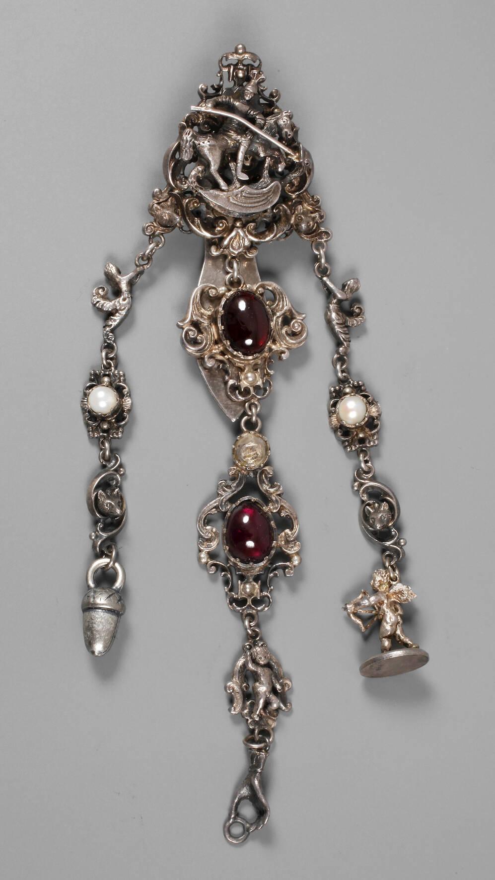 Moskau, Ende 19. Jh., gestempelt 84 Zolotniki, Stadtmarke Moskau und Meisterpunze AR, besetzt mit Granat und Perlen, spätere Abhängungen, Hand, Eichel und Engel als Amor, nicht ganz komplett, L 18 cm, G ca. 81 g.