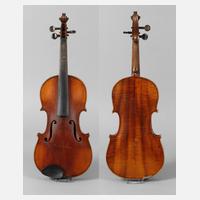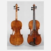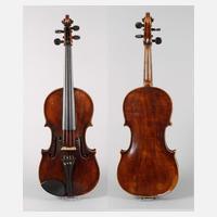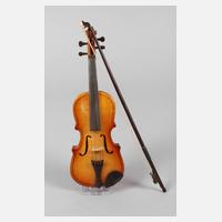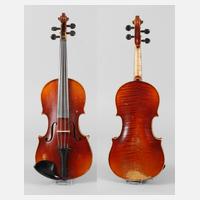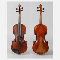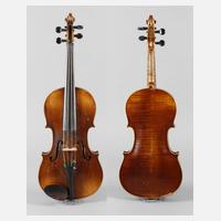 Mitte 20. Jh., mit Modellzettel Antonius Stradiuarius Cremonensis sowie Zusatz Made in Czechoslovakia, stark geflammter, geteilter Boden in gelb-rötlichem Lack, umlaufende, dreiteilige Fadeneinlage, rissfreie Decke, mit defektem Bogen, im Etui, Altersspuren, L Korpus 36 cm.