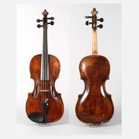 um 1920, mit Modellzettel Jacobus Stainer Absam 1796 sowie weiterer rückseitiger Brandstempel Stainer, geteilter, gleichmäßig geflammter Boden in dunkelbraunem Lack, umlaufende, zarte dreiteilige Randeinlage, rissfreie Decke, mit zwei defekten Bogen, im Etui, Alters- und Gebrauchsspuren, L 35,5 cm.