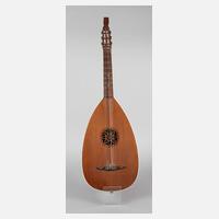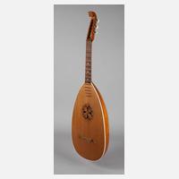 wohl Markneukirchen, 1. Hälfte 20. Jh., fächerartig gegliederter Boden, rissfreie Decke aus Resonanzfichte, umlaufende Ziereinlagen aus hellem Kunststoff, floral durchbrochenes Schallloch, leichte Alters- und Gebrauchsspuren, L 95 cm.