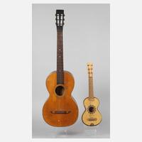 wohl Markneukirchen 1920er Jahre, ungemarkt, geteilter, leicht geflammter Boden, rissfreie Decke aus Resonanzfichte, beigegeben Spielzeuggitarre, gemarkt Haro Instrument Made in Germany, beide mit stärkeren Alters- und Gebrauchsspuren, L 90 und 50 cm.