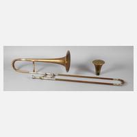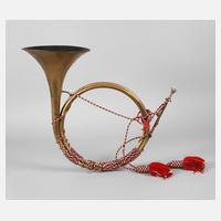 Anfang 20. Jh., gemarkt Sächsische Musikinstrumenten-Manufaktur Schuster & Co. Markneukirchen, Gehäuse aus getriebenem Messing, Nickelmontierungen, mit Mundstück und Schalldämpfer, Altersspuren, etwas gedellt, L ca. 120 cm.