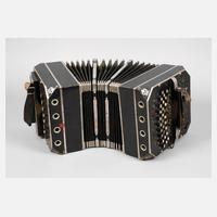 1. Hälfte 20. Jh., rüsterfurniertes Gehäuse, mit vernickelten Metallteilen und Druckknöpfen aus Bein bzw. Perlmutt, von Ornamentpapier beklebter Blasebalg, intakt, Alters- und Gebrauchsspuren, im Etui, mit handschriftlichem Notenbuch, L Etui 45 cm.