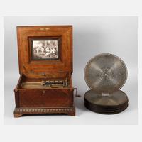 um 1890, gemarkt, Seriennummer 121998?, palisanderfurniertes Gehäuse, der Deckel mit eingelassener floraler Intarsie, die Ecken mit geschnitztem Schuppendekor, Deckelinnenseite verglast und von possierlicher Litho verziert, Spielwerk mit eineinhalb Kämmen, drei Zähne des Stimmkamms fehlen, Werk reparaturbedürftig, dazu ca. 38 Platten, Maße 30 x 48 x 55 cm.