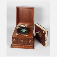 um 1920, ungemarkt, mahagonifurniertes Gehäuse mit Verzierungen aus Messing und intarsierten Buketts mit Perlmutteinlagen, verchromte Metallteile, originale Kurbel, funktionstüchtig, beigegeben 15 Platten, Alters- und Gebrauchsspuren, Substanzverluste, Maße 33 x 46 x 42 cm.