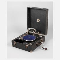 1920er Jahre, gemarkt Voxonette, kunstlederummantelter Hartschalenkoffer mit verchromten Metallteilen, steckbarer Tonabnehmer, Plattenteller mit Stopp-Automatik, Geschwindigkeitsregelung und Kurbel, funktionstüchtig, Altersspuren, Maße 14 x 27 x 33 cm.