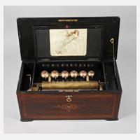 um 1895, ungemarkt, Seriennummer 3376, langrechteckiges Gehäuse in Palisander furniert, mit üppigen Intarsienarbeiten aus Vogelaugenahorn, Ebenholz, Esche und weiteren Edelhölzern, Deckelinnenseite mit lithografierter Feendarstellung, verglastes Innenleben mit massiver Walze und intaktem Stimmkamm, zuschaltbares sechsteiliges Glockenspiel, spielt mehrere Melodien, funktionstüchtig, Gewichte mit Zinnfraß, Dämpfung rep.bed., Alters- und Gebrauchsspuren, Maße 27 x 59 x 28 cm.
