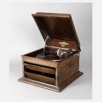 um 1920, gemarkt Columbia, Made in England, eichefurniertes Gehäuse, verchromte Metallteile, Tonabnehmer gemarkt Primator, mit originaler Kurbel, funktionstüchtig, Alters- und Korrosionsspuren, Maße 33 x 44 x 50 cm.