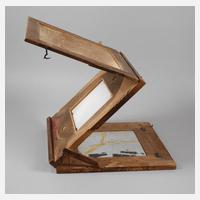 wohl Mitte 19. Jh., klappbarer Korpus aus massiver Buche, mit Milchglasscheibe und Spiegel, Spiegelglas gerissen, Alters- und Gebrauchsspuren, Maße H ca. 50 x 40 x 41 cm. Info und Quelle Wikipedia: Der britische Chemiker und Physiker William Hyde Wollaston meldete 1806 unter dem Namen Camera Lucida ein Patent für ein Zeicheninstrument an, dessen Prinzip schon länger bekannt war. U.a. scheint schon Johannes Kepler ein solches Gerät gekannt zu haben. Die Camera lucida erfüllte einen ähnlichen Zweck wie die Camera obscura und wurde zum Abzeichnen von Landschaften oder Portraits verwendet, die Camera Lucida ist ein viereckiges Prisma, das zur Anwendung im Freien auf eine Halterung montiert und auf der Zeichenunterlage befestigt oder am Okular eines Teleskops oder eines Mikroskops angebracht wird. Bei der Camera lucida blickt man durch ein Guckloch direkt über die Kante des Prismas, das die Umrisse des Motivs auf das Zeichenpapier wirft. Der Benutzer kann dadurch gleichzeitig die Umrisse des Motivs und das Papier sehen und das Objekt dann einfach abzeichnen. Mit der Camera lucida wird also vor allem das Anfertigen von relativ naturgetreuen Bildern vereinfacht.
