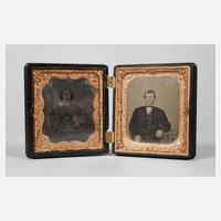 um 1880, als Pendants gerahmte Portraits eines Ehepaars in reliefiertem, scharniertem Klapprahmen aus dunkler Masse, vergoldete Passepartouts, Rahmen am Scharnier mit Ausbruch, Damenbildnis stark nachgedunkelt, Maße 9 x 8 cm.