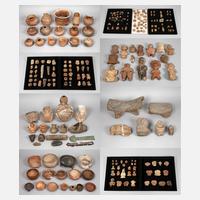 etwa 300 Stück, meist Maya, frühklassische Periode 300 v. Chr. bis 300 n. Chr. bis postklassische Periode 900 bis 1200 n. Chr., aber wohl neben mittelamerikanischen Kulturen auch Südamerika vertreten, Sammlung bestehend aus: Metates (Mahlsteine) und einem zoomorphem Götterstein aus Vulkangestein, zahlreichen Keramikgefäßen wie ein großes Gefäß in Gestalt eines Affen, Vierfußschale mit Vogeldarstellung im Tondo, Teller in der Art des Usulutan-Stils, Schale mit Darstellung kniender Maya auf der Außenseite sowie eine dergleichen mit abstrahierter figürlicher Darstellung (sitzende Figuren mit Federkopfschmuck), dergleichen mehrere mit Glyphenmalerei, davon eine mit Affendarstellung, reich bemaltem Becher mit Flechtbanddekor, kugelbauchigen Doppelhenkelgefäßen mit anthropomorph gestalteten Hälsen, Applikengefäßen, Schale mit Maskenfüßen, hoher Schale auf Füßen in Form von Früchten oder Eutern, zahlreichen Götterfiguren/Statuetten, Miniaturgefäßen, Stempeln, Tonperlen, Steinartefakten, einer hölzernen Miniatur-Ritual-Hand, einer Terrakotte mit den Gesichtszügen eines peruanischen (Chimu?) Gottes (maskenförmige Augen). - Insgesamt ca. 50 Gefäße und Gefäßfragmente, ca. 170 Figuren/Statuetten/Fragmente/Amulette, ca. 10 Steinartefakte und figürliche Steinarbeiten, zahlreiche Ton- und Steinperlen ungezählt. - Sammlung vor 1970 von einer ausgewanderten Familie zusammengetragen, 1972 bei der Rückkehr nach Deutschland mitgebracht.