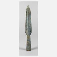 unbestimmt, vielleicht Shang-Dynastie, 12. Jh. v. Chr., Bronze, zweiflügelige Spitze mit Mittelgraten, zur Tülle zu Einschnürung, an der Tülle einseitig eine Öse, am Tüllenkopf gebrochen und geklebt, Holzreste des Schaftes, schöne Patina, L ca. 18,7 cm.