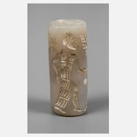 wohl Mesopotamien, 2. Jahrtausend v. Chr., zylindrisches, röhrenförmiges Siegel mit mittiger Durchbohrung, aus einem weißlichen, berkristallartigen Gestein, die Abrollung zeigt einen Mann mit Gefäß vor einem sitzenden Herrscher, hinter diesem auf einer Säule ein Phönix oder Greif, L ca. 35 mm, D ca. 15 mm.