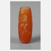 wohl Mesopotamien, 1. bis 2. Jahrtausend v. Chr., zylindrisches Trommelroll-Siegel mit mittiger Durchbohrung, Carneol-Gestein, die Abrollung zeigt drei Männer mit Dolch und Greifvogel, L ca. 35 mm, D ca. 12 mm.