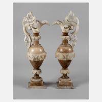 Ende 19. Jh., aus verschiedenfarbigem Alabaster gefertigt, über getrepptem Stand gebauchte Henkelkannen, mit reichem plastischen Weinblatt- und Volutendekor, partiell alt rep., min. best., H je 44 cm.