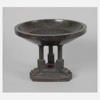um 1910, Zöblitzer Serpentinstein AG, aus dunkelbraunem, fast schwarzem Granatserpentin gestaltete tief gemuldete Schale mit steil ansteigender Wandung und planem Rand, der Fuß aus dunkel patinierter Bronze mit drei angedeuteten Pilastern später ergänzt, Altersspuren, winz. best., H 20 cm, D 27 cm.