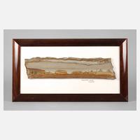 bezeichnet „Landschafts Achat Toskana“, überaus fein geädertes, langrechteckiges Segment, geschnitten und poliert, auf Karton montiert und gerahmt, Platte gebrochen, Maße gesamt 46 x 26 cm.