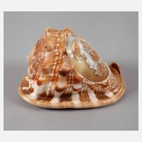 wohl Italien 19. Jh., Meeresschnecke aufwendig beschnitzt und partiell poliert, als Gemme gearbeitetes Portrait einer antikisierenden Schönheit mit weinlaubverziertem Haar, winz. best., L15 cm.
