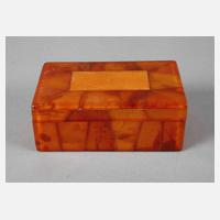 um 1930, ungemarkt, rechteckiger Korpus mit scharniertem Deckel, umlaufend mit honigfarbenen Bernsteinsegmenten belegt, innen in cremefarbener Seide ausgekleidet, Maße 3,5 x 9 x 5,5 cm.