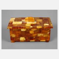 Mitte 20. Jh., rechteckige Deckeldose aus verschieden großen, mehrfarbigen Bernsteinsegmenten, kleine Fehlstellen, Maße 4,5 x 9,5 x 5,5 cm.