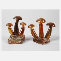 20. Jh., aus verschiedenen Bernsteinsegmenten montierte Zierobjekte in Form dreier Pilze, H 8 und 9,5 cm.