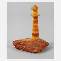 20. Jh., auf einem massivem Bernsteinsegement montierter Leuchtturm aus mehreren kleinen, verschiedenfarbigen Elementen, Butterscotch ebenso wie dunklere Tönungen, winz. best., H 12 cm, G ca. 90 g.