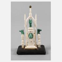 19. Jh., aus Elfenbein und Malachit geschnitzt, partiell vergoldet, zentrale Stele mit gravierter Fliege und Rosenmotiv, bekrönt von Pferdehaupt, ebensolche flankieren des Mittelstück, auf flacher geschwärzter Holzplinthe, nicht ganz komplett, H 10 cm. BITTE BEACHTEN: VERSAND ERFOLGT NUR INNERHALB DER EU - SHIPPING TO THE EU MEMBER COUNTRIES ONLY.