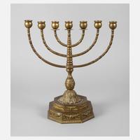 um 1890, Messing gegossen, Reste alter Vergoldung, zweiteiliger getreppter Fuß verziert mit Festons und Palmetten, blattverzierter Schaft, drehbare Leuchterarme, schraubbare Tüllen, Gebrauchs- und Altersspuren, H 38 cm.