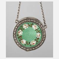 wohl Wien, um 1910, Alpacca versilbert, innen vergoldet, ungepunzt, mit originalem Spiegeleinsatz, scharnierter Klappdeckel mit umlaufendem Ornamentband, transluzid emailliert auf Guillochégrund, bemalt mit Rosenblüten, an Erbskettchen, L 12,5 cm.
