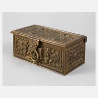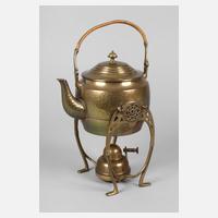 um 1920, Messing, mit klappbarem Henkel und Bastwicklung, partiell martelliert, abnehmbarer Deckel, Rechaud mit seitlichen Rosetten verziert, originaler Brenner, stärkere Gebrauchsspuren, H 33 cm.