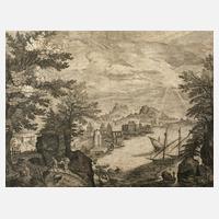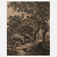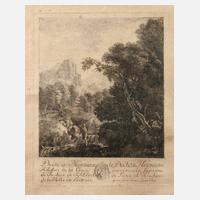 ruhende Wanderer in hügeliger Waldlandschaft, Radierung mit schönem Hell- Dunkelwerten, erste Hälfte 18. Jh., oben links Monogramm „A. W. f.“, etwas fleckig, bis an Plattenrand beschnitten, hinter Glas gerahmt, Darstellungsmaß ca. 28,5 x 23,2 cm.