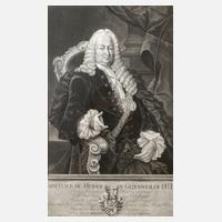 auf einem Sessel sitzender elegant gekleideter Herr mit dem Betrachter entgegen gerichteten Blick, unter der Darstellung in der Platte zahlreiche Angaben zu Gottlieb von Heider von und zu Gitzenweiler (1679 bis 1753), Mezzotintoradierung, 2. Hälfte 18. Jh., in der Platte signiert "Andreas Löscher pinx" und "J. J. Haid sculps Aug. Vind", minimale Erhaltungsmängel, unter Passepartout und hinter Glas gerahmt, Passepartoutausschnitt ca. 43 x 28,5 cm. Künstlerinfo: auch Johann Jakob Hayd, bedeutender dt. Maler, Mezzotintostecher und Verleger (1704 Süßen bis 1767 Göppingen), 1726 ging er zur Ausbildung nach Augsburg hier Schüler von Georg Philipp Rugendas und Johann Elias Ridinger, tätig in Augsburg, wo er ein eigenes Verlagshaus gründete, zu seinen Schülern zählten Anton Graff und Friedrich Bause, Quelle: Thieme-Becker und Wikipedia.
