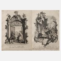 jeweils betitelt "Freude in Friedenszeit" und "Facon moderne d´une Porde de Jardins", Kupferstich, um Mitte 18. Jh., jeweils in der Platte signiert "J. E. Nicholson ...", mittlere Erhaltungsmängel, unter Passepartout und hinter Glas gerahmt, Passepartoutausschnitt max. ca. 29,5 x 20 cm. Künstlerinfo: dt. Miniaturmaler, Zeichner und Kupferstecher (1721 Augsburg bis 1788 Augsburg), Mitglied einer bekannten Künstlerfamilie, betrieb ab 1751 einen florierenden Kunstverlag, 1764 zum kurpfälzischen Hofmaler ernannt, Thieme-Becker bezeichnet ihn „ Einer der fruchtbarsten Meister des profanen deutschen Rokoko. Vorzüglicher Miniaturmaler, Aquarellist u. Zeichner, der den flüssigen Stil der Rocaille ausgezeichnet beherrscht und zu variieren weiß“, Quelle: Thieme-Becker.