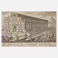 Darstellung des berühmten und zu den sieben Weltwundern zählenden Tempel mit Steinmetzen und König im Vordergrund, unter der Darstellung ausführlich bezeichnet und datiert „Der Göttin Dianae Tempel zu Ephesus“, Kupferstich 1. Hälfte 18. Jh., unter der Darstellung und in der Platte signiert „Gottfrid Pfaunz sculps.“, kleiner Einriss und Wurmloch, leichte Erhaltungsmängel, Darstellungsmaß ohne Schrift ca. 16,8 x 29,0 cm, Blattmaß ca. 20 x 30 cm. Künstlerinfo: auch Johann Gottfrid Pfauntz oder Pfauz, dt. Maler, Kupferstecher und Verleger (um 1687 Ulm bis 1760 Augsburg), tätig in Augsburg, Quelle: Thieme-Becker und Internet.