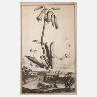 Ansicht der Hesperidengärten in Nürnberg und im Vordergrund detaillierte Pflanzendarstellung, diese bezeichnet „Cotyledon Africana frutescens.“, Kupferstich, 2. Hälfte 17. Jh., geringe Erhaltungsmängel, unter Passepartout und hinter Glas gerahmt, Darstellungsmaß ca. 31,3 x 19,7 cm.