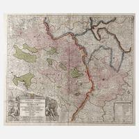 links unten prächtige, figürliche Kartusche, hierin betitelt "Palatinatus Inferior sive Electoratus Palatinus ab Rhenum...", sowei Angabe des Geographen "Tobiae Conradi Lotter", Darstellung des Gebietes zwischen Cochem im Norden, Gundelsheim im Osten, Pforzheim im Süden und Saarlouis im Westen, teilkolorierter Kupferstich, Mitte 18. Jh., mittig übliche Faltlinie, geringe Erhaltungsmängel, hinter Glas gerahmt, Darstellungsmaß ca. 48,5 x 56,3 cm. Künstlerinfo: auch Tobias Conrad Lotter, dt. Landkartenstecher Kartograph und Verleger (1717 Augsburg bis 1777 Augsburg), ab 1740 Schwiegersohn und produktivster Mitarbeiter des Karthographen und Verlegers Matthäus Seutter, 1740-44 schuf er eigenverantwortlich unter Seutter den ‘Atlas Minor‘, nach dem Tode von Seutter (1757) führten sein Sohn Albrecht Karl (1722-1762) und sein Schwiegersohn Lotter sowie G. B. Probst die Firma weiter, 1757/58 wurde Lotter alleiniger Eigentümer des Verlages, Quelle: Thieme-Becker und Wikipedia.