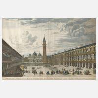 Ansicht des bekanntesten Platzes von Venedig mit Markusdom und Markusturm, unter der Darstellung bezeichnet, kolorierter Kupferstich, 1. Hälfte 18. Jh., unter der Darstellung in der Platte signiert "Mich. Marieschi del." (Zeichner der Vorlage), mittig übliche Faltlinien, unter Passepartout und hinter Glas gerahmt, Passepartoutausschnitt ca. 28 x 42,5 cm.