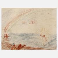 Jesus unter einem Regenbogen über das Wasser schreitend, Farblithographie, um 1890, im Stein links unten signiert "Ensor", auf Unterlagekarton montiert, Montierung leicht durchschlagend, hinter Passepartout montiert, Darstellungsmaß ca. 15,3 x 20,3 cm, Blattmaß ca. 18 x 23 cm. Künstlerinfo: belgischer Maler und Graphiker (1860 Ostende bis 1949 Ostende), Mutter betrieb ein Geschäft für Geschenk und Karnevalsartikel welches das Werk des Künstlers prägen sollten, ab 1876 Besuch der Akademie der Schönen Künste in Ostende, 1877-80 Studium an der Kunstakademie in Brüssel, 1880 Rückkehr nach Ostende, den Höhepunkt seiner Bekanntheit erreichte der Künstler in den 1920iger Jahren, 1929 durch König Albert Verleihung des Titels eines Baron, Quelle; Wikipedia und Internet.