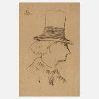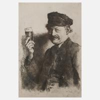 auch Bildnis des Wirts Rauecker, dem Betrachter freundlich zuprostender Herr mit Mütze, Radierung auf Chinapapier, auf Bütten gewalzt, rechts im Druck signiert und datiert „W. Leibl 1874“ , unterhalb der Darstellung bezeichnet „Druck von P. Kaeser in Wien" und "Vervielfältigung verboten“, minimale Erhaltungsmängel, unter Passepartout in Bilderträger gerahmt, Darstellungsmaß ca. 21 x 14,5 cm. Künstlerinfo: eigentlich Wilhelm Maria Hubertus Leibl, bedeutender dt. Maler, Zeichner und Graphiker (1844 Köln bis 1900 Würzburg), zunächst Lehre als Schlosser, ab 1861 Schüler bei Hermann Becker in Köln, studierte ab 1863 an der Akademie München bei Hermann Anschütz, Alexander Strähuber, Arthur Georg von Ramberg und ab 1868 bei Carl Theodor von Piloty, unterhielt ab 1869 Freundschaft zu Gustave Courbet, 1869 gemeinsames Atelier mit Theodor Alt, Rudolf Hirth du Frênes und Johann Sperl in München, 1869-70 Studienreise nach Paris, 1870 Gründung des “Leibl-Kreises” der bis 1875 Bestand hatte und dem unter anderem Wilhelm Trübner, Carl Schuch, Theodor Alt, Karl Haider und zeitweise auch Hans Thoma angehörten, 1873 Rückzug aus dem Münchner Kunstleben, lebte seidem zusammen mit dem Maler Johann Sperl in Berbling und Bad Aibling in Oberbayern, 1892 Ernennung zum Professor, Anfang 1900 wegen Herzleiden zur Kur in Bad Nauheim und Weiterreise zur Schwester Katharina Kirchdorffer geborener Leibl nach Würzburg, Quelle: Thieme-Becker, Matrikel der Münchner Akademie und Wikipedia.