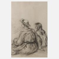Rückenansicht von zwei auf dem Boden sitzenden Mädchen, Lithographie, Ende 19. Jh., unter der Darstellung im Stein signiert "Renoir", geringe Erhaltungsmängel, unter Passepartout und hinter Glas gerahmt, Passepartoutausschnitt ca. 39 x 27 cm. Künstlerinfo: eigentlich Pierre-Auguste Renoir, frz. Maler und Radierer (1841 Limoges /Limousin bis 1919 Cagnes-sur-Mer / Côte d' Azur), ab 1845 Kindheit in Paris, ab 1854 Lehre und Tätigkeit als Porzellanmaler, studierte 1861-64 Malerei bei Charles Gleyre, beeinflusst von Gustave Courbet und Diaz de la Peña, später fand sein Interesse an Raffael und Jean-Auguste-Domenique Ingres Niederschlag in seiner Kunst, unterhielt Freundschaft zu Claude Monet, Alfred Sisley, Frédéric Bazille und Édouard Manet, beschickte ab 1864 den Pariser Salon, unternahm Studienreisen nach Algerinen, Italien (Palermo) und auf die Insel Guernsey, zunächst in Paris freischaffend,1907 Umzug nach Cagnes-sur-Mer an der Côte d' Azur, Quelle: Thieme-Becker, Bénézit und Wikipedia.