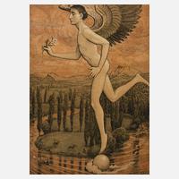 auf einer Kugel daher eilendes geflügeltes Fabelwesen mit weißer Lilie in der Hand, Algraphie, im Druck ligiertes Monogramm und datiert „HTh 1897“, unterhalb der Darstellung in Tusche bezeichnet „Das Glück“, leichte Erhaltungsmängel, Darstellungsmaß ca. 49 x 36 cm, Blattmaß ca. 53 x 41,5 cm. Künstlerinfo: dt. Maler und Graphiker (1839 Bernau bis 1924 Karlsruhe), zunächst zeitweise Lehre als Lithograph und Stubenmaler in Basel sowie Uhrenschildermacher in Furtwangen, parallel autodidaktische Mal- und Zeichenstudien, studierte 1859-66 an der Kunstschule Karlsruhe bei Ludwig Des Coudres und Johann Wilhelm Schirmer, anschließend kurzzeitig in Basel und Düsseldorf, 1868 Aufenthalt in Paris hier beeinflusst von Gustave Courbet und der Schule von Barbizon, 1870-76 in München, 1874 erste Italienreise mit Aufenthalt in Rom, ab 1878 tätig in Frankfurt am Main, 1899-1901 in Kronberg und Mitglied der Kronberger Malerkolonie, freundschaftlich verbunden und angeregt durch Arnold Böcklin, Wilhelm Leibl, Wilhelm Steinhausen und Wilhelm Trübner, 1899 zum Professor ernannt, 1899-1920 Direktor der Kunsthalle Karlsruhe, Quelle: Thieme-Becker und Internet.