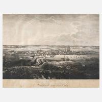 Blick von einer bewachsenen Anhöhe mit Figurenstaffage auf eine am Meer liegende größere Stadt mit Hafen, Kupferstich, 17. Jh., in der Platte signiert "Petrus Stephani Inven." (hat erfunden), etwas braunfleckig, unter Passepartout und hinter Glas gerahmt, Passepartoutausschnitt ca. 19,7 x 26 cm.